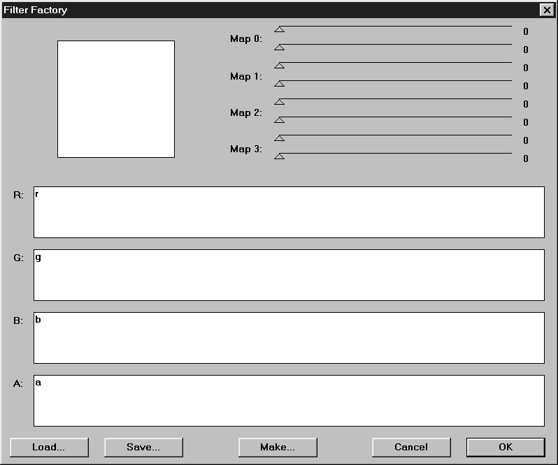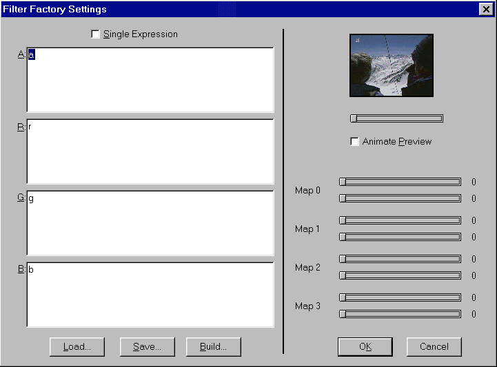 As in Photoshop's Filter Factory there are four text fields for entering the filter code, as well as a preview and 8 Sliders above it. The Buttons "Load", "Save" and "Build" have also the same functions as in Photoshop. New is the slider under the preview and the checkbotton Animate Preview. By dragging the slider you can see the result of the filter on every frame of a video and by activating the checkbox the video is played to show the effect of your code continously. When activating the checkbox "Single Expression" three of four code fields disappear. The code entered in the remaining field is used on all four channels (R, G, B, A).