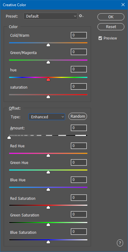 The Offset group offers four additional effect, which can be selected from the Type combo box. These effects are exclusive, so if you choose another effect, the previous one is not applied anymore. The Random button assigns random values to the sliders in this group (except for the Amount slider), which allow you to explore the potential effects.