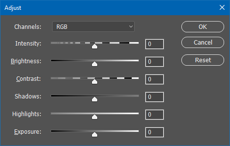 To reset the slider values to zero you can click the Reset button. The Cancel button will also undo the adjustments and close the dialog. The OK button keeps the adjustments.