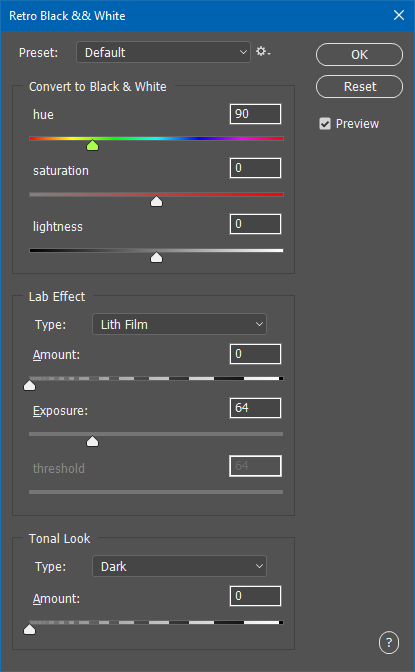 The sliders in the Convert to Black & White group determine the color filter for doing the b&w conversion. The Hue slider lets you choose a color for doing the b&w conversion. For example, if you choose a red color with the Hue slider, the red areas of the color image will get bright in the b&w image. As cyan is the complementary color of red the cyan image areas will get dark. All other areas will have mid gray tones. The Saturation slider as an influence on the contrast of the black & white look and the Lightness slider adjust the brightness.