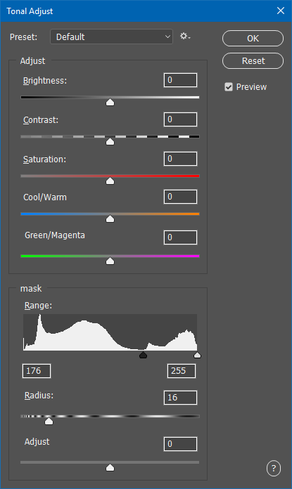 The Mask group lets you define the image area that is affected by sliders of the Adjust group and basically creates a mask. The Range control displays a histogram and lets you visually select the tonal range that is targeted. You can move the two slider knobs to the left to edit the shadows, keep them in the middle for the midtones and move them to the right for the highlights. You can also edit the whole image by setting the black knob to zero and the white one to 255.