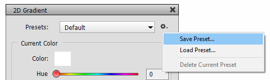 The Save Preset menu item saves the current settings as a preset file for later use. In the appearing file dialog best keep the preselected folder to make sure that the new preset appears in the Preset combo box.