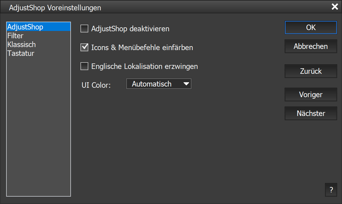 Wenn Sie diesen Menüpunkt im Voreinstellungen-Untermenü klicken, wird ein Dialogfenster geöffnet, mit dem Sie die Einstellungen von AdjustShop ändern können. Sie können zwischen verschiedenen Einstellungsgruppen wählen, indem Sie die Liste rechts verwenden oder Voriger und Nächster anklicken. Um alle Optionen auf die vorherigen Ausgangseinstellungen zurück zu setzen, klicken Sie auf die Zurück-Schaltfläche. Drücken Sie OK, um die Änderungen anzuwenden oder auf Abbrechen, um sie für ungültig zu erklären.