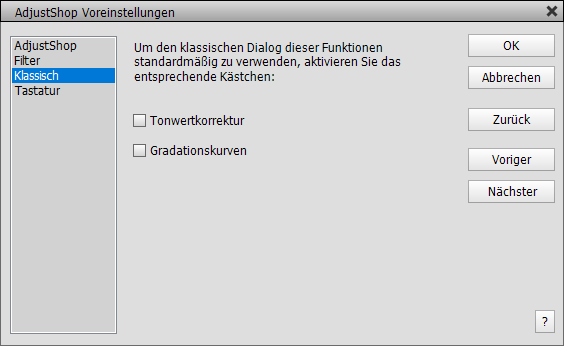 Die Klassisch-Seite erlaubt es, einige Dialoge von AdjustShop zu deaktivieren, welche normalerweise die ursprünglichen Dialoge von Photoshop (Elements) ersetzen. AdjustShop ersetzt diese klassischen Dialoge, um mehr Optionen bereit zu stellen oder um Probleme zu vermeiden. Daher ist es üblicherweise keine so gute Idee diese Kästchen zu aktivieren. Aber sie sind dennoch verfügbar, falls Sie einen klassischen Dialog bevorzugen.