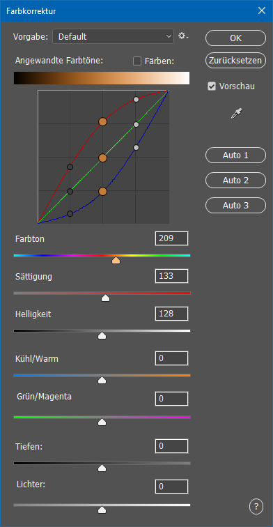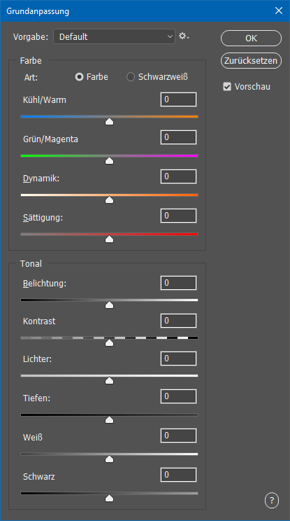 Um die Reglerwerte auf Null zurück zu setzen, können Sie auf die Schaltfläche "Reset" klicken. Auch die Schaltfläche "Abbrechen" macht die Anpassungen rückgängig, aber schließt den Dialog. Die Schaltfläche "OK" behält die Anpassungen bei.