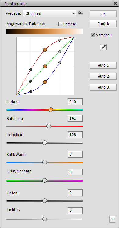 Die Farbkorrekturfunktion ermöglicht Ihnen, einen Farbstich aus einem Bild zu entfernen. Sie können das Bild auch einfärben, indem Sie das Färben-Kästchen aktivieren, was den gegenteiligen Farbeffekt zur Anwendung bringt. Die angewandte Farbkorrektur oder die Einfärbung können in der Leiste "Angewandte Farbtöne" unterhalb des Färben-Kästchens eingesehen werden. Wenn Sie auf die Farbleiste klicken, erscheint ein Farbdialog, mit dem Sie die verwendete Farbe editieren können.