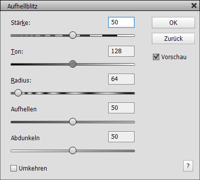 Der Aufhellblitz Filter ist dazu da, den Effekt eines Blitzlichtes auf der Kamera zu simulieren. Dies hellt dunklere Bildbereiche auf und dunkelt hellere Bereiche ab.