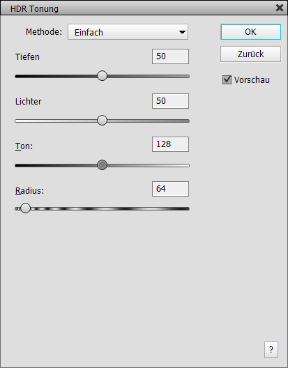 HDR Tonung ermöglicht, die Tiefen- und Lichtertöne zu komprimieren, um einen HDR-ähnliches Aussehen zu produzieren. Dieser Filter ähnelt dem Tiefen/Lichter-Dialog, erzielt aber einen natürlicher wirkenden Effekt. Die Einfach-Modus bietet weniger Regler und wird schneller berechnet als der Komplex-Modus, welcher mehr Regler für separate Tiefen- und Lichteranpassungen bietet. Beide Modi verwenden individuelle Reglerwerte, somit werden beim Wechsel zum anderen Modus nicht die Reglerwerte des vorhergehenden Modus übernommen.