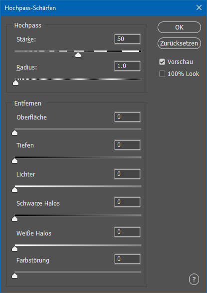 Das Kästchen 100% Look erlaubt es, den Schärfeneffekt bei 100% Zoom zu betrachten. Falls ein Vorschaubild verwendet wird, wird die Vorschaufunktion deaktiviert und das Berechnen des Effekts könnte länger dauern.