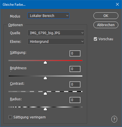 Zwei verschiedene Effekte sind im Modus-Kombinationsfeld wählbar. Der Effekt Globales Licht nimmt die Durchschnittsfarbe eines anderen Bildes, um das aktuelle Bild einheitlich einzufärben. Der Effekt Lokaler Bereich greift sich Farben aus verschiedene Bereichen des anderen Bildes wodurch das Bild lokal unterschiedlich gefärbt wird. Das Kästchen Sättigung verringern bewirkt, dass das Bild nur in der Helligkeit verändert wird, und nicht farblich. Der Sättigung-Regler beeinflusst die Sättigung des Farbeffekts. Mit den Helligkeit- und Kontrast-Reglern können Sie den Effekt an die Helligkeit und den Kontrast des Quellbildes oder der -ebene anpassen. Der Radius-Regler bestimmt die Größe der Bereiche, aus denen die Farben für den Lokalen Bereich Effekt aufgenommen werden.