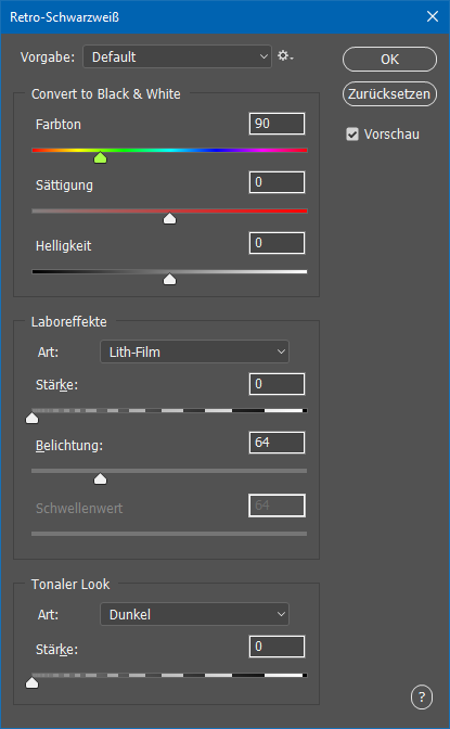 Die Regler in der In-Schwarzweiß-konvertieren-Gruppe legen den Farbfilter für die Schwarzweißkonvertierung fest. Mit dem Farbtonregler wählen Sie die Farbe des Konvertierungsfilters. Wenn Sie sich beispielsweise für eine rote Farbe entscheiden, werden die roten Bereiche des Farbbildes im Schwarzweißbild hell. Da Cyan die Komplementärfarbe zu rot ist, werden die cyanfarbenen Bereiche dunkel. Alle anderen Bereiche haben dann mittelgraue Töne. Der Sättigung-Regler beeinflusst den Kontrast des Schwarzweißlooks und der Helligkeit-Regler passt die Helligkeit an.