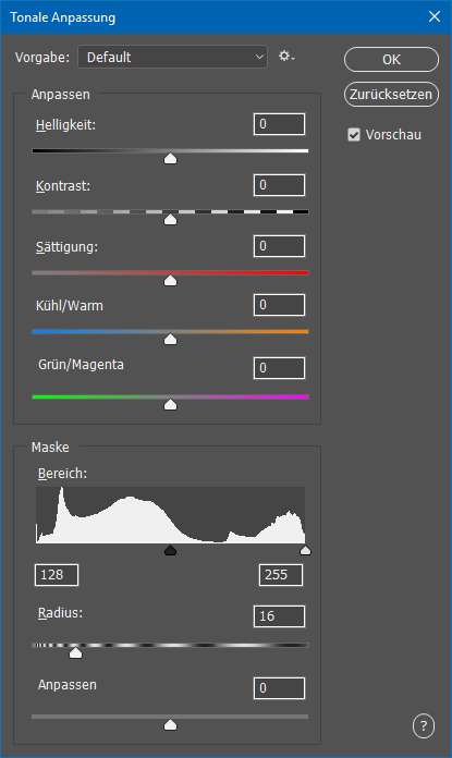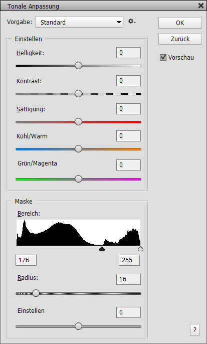 Die Funktion "Tonale Anpassung" zielt auf Bildbereiche mit bestimmten Tonwerten und verändert deren Helligkeit, Kontrast und Farbe. Es ist eine etwas fortgeschrittlichere Version des Tiefen/Lichter-Filters, da Sie die Tiefen und Lichter selbst festlegen und auch die lokalen Ränder des Bildbereiches anpassen können.