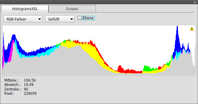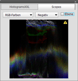 Wie beim HistogramsXXL-Bedienfeld, können Sie das Ebene-Kästchen aktivieren, um lediglich das Scope der aktuellen Ebene anstatt des ganzen Bildes zu sehen. Um nur das Scope eines bestimmten Bildbereichs zu betrachten, können Sie eine Auswahl erstellen. Eine Ausrufezeichen wird in der rechten oberen Ecke angezeigt. Klicken Sie dieses, um die Scopes bei voller Bildgrösse zu berechnen. Dies wird standardmässig nicht getan, damit Photoshop (Elements) nicht ausgebremst wird.