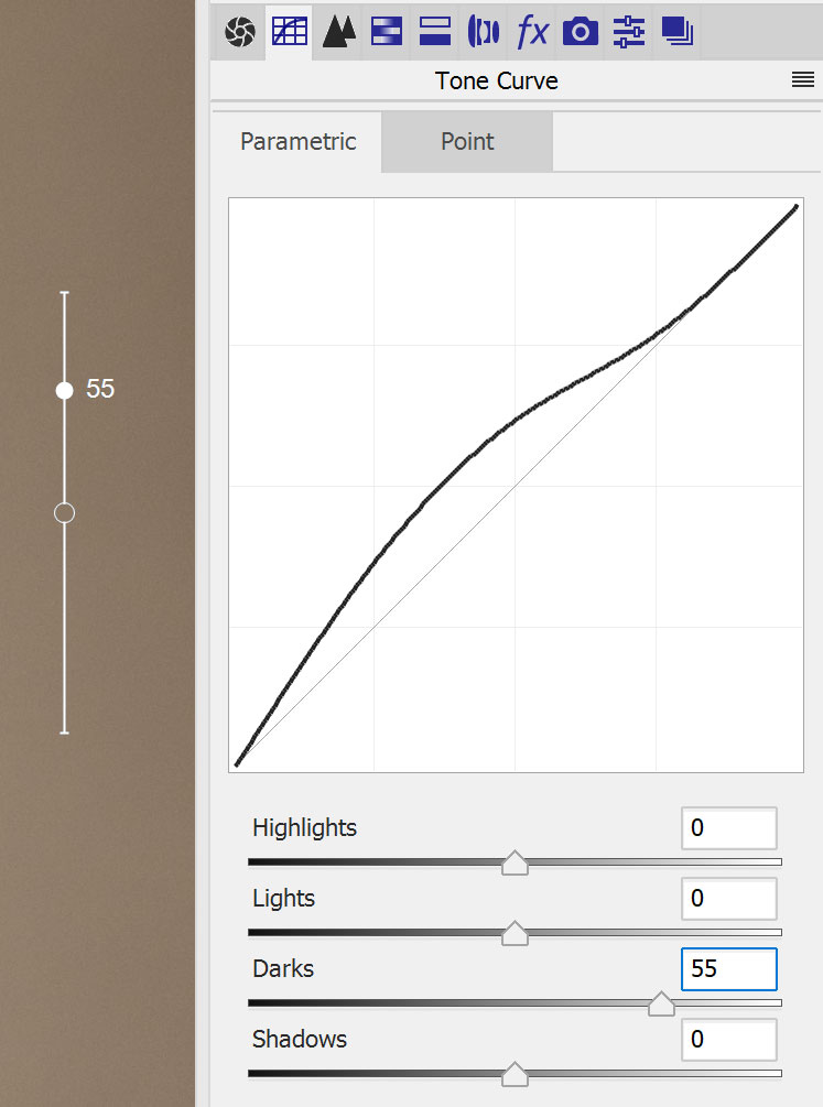 To start with this tool click a tone or color area on the preview that you want to adjust and hold down the left mouse button. In the above screen shot a rather dark area was clícked, which automatically made the tool adjust the Darks slider on the Parametric tab sheet. If you click on a lighter area, either the Highlights or the Lights slider will be activated. For the other tool settings the corresponding color slider is automatically selected and adjusted according to the clicked color.