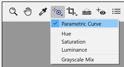 You can select it by clicking on its icon in the tool bar at the top left corner. If you hold down the left mouse button for more than a second a context menu pops up. With this context menu you can select which setting will be affected by this tool. You can either adjust the sliders of the parametric curve on the Tone Curves tab sheet or the sliders on the HSL/Grayscale tab sheet.