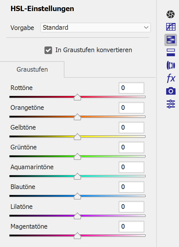 Wenn das Kästchen "In Graustufen konvertieren" nicht aktiviert ist, können Sie Farbton-, Sättigung- und Luminanz-Registerkarten sehen, andernfalls erscheint eine Graustufen-Registerkarte und das Bild wird in Schwarzweiß konvertiert. Jede der vier Registerkarten enthält acht Regler mit den selben Namen. Der Wert jedes Reglers geht von -100 bis 100.