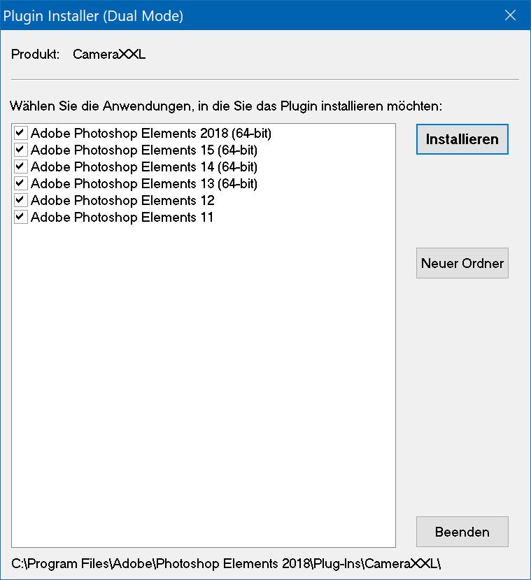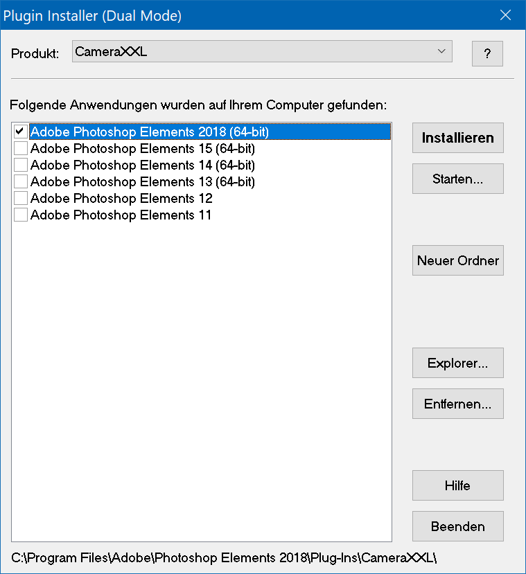 Wenn Sie eine neue Version von Photoshop Elements installieren und CameraXXL bereits installiert ist, müssen Sie nicht mehr das komplette Installationsprozedere von CameraXXL durchführen. Sie können Plugin Installer vom Startmenü aus starten und es verwenden, um CameraXXL in die neue Version von Photoshop Elements zu installieren.