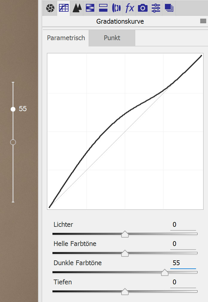 Um mit diesem Werkzeug zu starten, klicken Sie auf einen Ton- oder Farbbereich in der Vorschau, den sie anpassen wollen und halten Sie die linke Maustaste gedrückt. Im Screenshot oben wurde ein ziemlich dunkler Bereich angeklickt, wodurch das Werkzeug automatisch den Regler "Dunkle Farbtöne" in der Parametrisch-Unterregisterkarte anpasst. Wenn Sie auf einen helleren Bereich klicken, wird entweder der Lichter oder Helle Farbtöne Regler aktiviert. Bei den anderen Werkzeugeinstellungen wird je nach angeklickter Farbe der entsprechende Farbregler automatisch ausgewählt und angepasst.