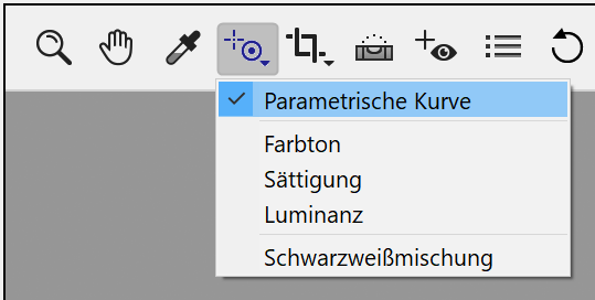 Sie können es auswählen, indem Sie auf das Symbol in der Werkzeugleiste oben links. Wenn Sie die linke Maustaste für mehr als eine Sekunde gedrückt halten, erscheint ein Kontextmenü. Mit diesem Kontextmenü können Sie auswählen, welche Einstellung von diesem Werkzeug angepasst werden. Sie können entweder die Regler der parametrischen Kurve auf der Gradationskurven-Registerkarte oder die Regler auf der HSL/Graustufen-Registerkarte anpassen.