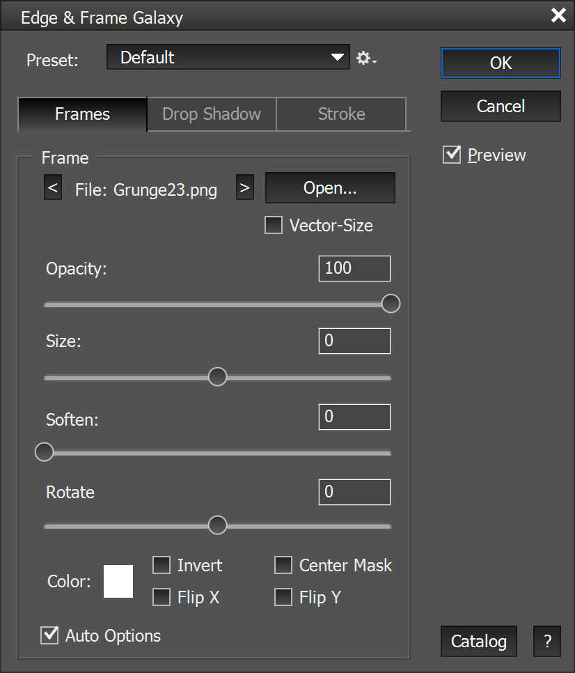 The effects of Edge & Frame Galaxy can be applied via a filter or as a fill layer in Photoshop and Photoshop Elements. The window of the Edge & Frame plugin offers up to 40 features for opening, applying and enhancing the edge or frame effect. Apart from changing the background color and transparency, you can also soften the borders as well as add drop shadow, bevel, stroke and glow effects. The edge or frame can be flipped vertically and horizontally or inverted.