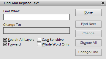If the Search All Layers check box is activated, all text layers are searched. A deactivated Forward check box searches the text backwards. An activated Case Sensitive check box makes sure that the case of the letter of the search term is not ignored. Whole Word Only treats the search term like a single word and not as multiple ones. For example, the term "of the" would not find separate "of" and "the" words but only "of the" text blocks.