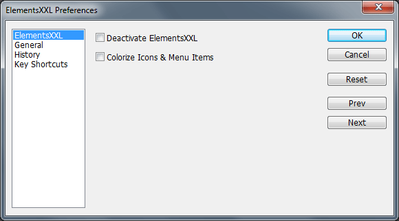 If you click on this menu item on the Preferences sub menu, a dialogue window is opened that lets you change the settings of Elements XXL. You can switch between different preferences groups by using the list on the right or by clicking the Prev and Next buttons. To set all options to the original default values click the Reset button. Press OK to apply the changes on this dialog or Cancel to discard them.