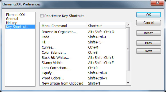 The Deactivate Key Shortcuts check box deactivates (and activates again) the key shortcuts of ElementsXXL. All available key shortcuts are shown in the list below. This feature works in all versions of Photoshop Elements.