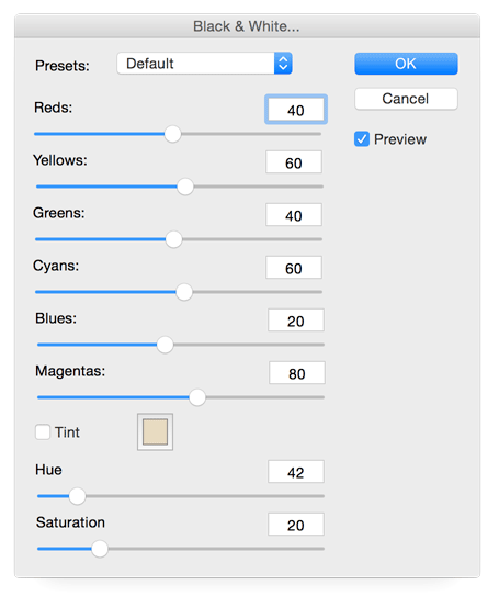The six top sliders define the black & white effect of the filter by mixing six different color channels, which are based on the RGB and CMY color models. To colorize the black and white effect activate the Tint check box. Now you can click on the color box to choose another color from a color dialog or use the Hue and Saturation sliders to adjust the color. The Auto button tries to find a balanced black & white mix by evaluating the image.