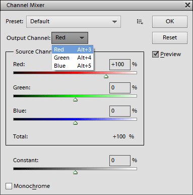 The Channel Mixer recomposes each color channel of an RGB image by blending the three RGB channels according to certain percentage values, which produces color effects. Additionally if the Monochrome check box is activated, you are able to create a black & white effect that is defined by a mix of the three color channels.
