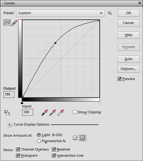 The curve can be adjusted with the help of points. To create a new point click somewhere in the diagram and drag. After releasing the mouse button a curve is drawn through the new point. You can adjust your point or add new points until you get the desired result. You can also adjust curve points by entering numbers in the Input and Output boxes. Alternatively draw your individual curve with the Pen tool and click the Smooth button to improve it. The Auto button automatically corrects the brightness, contrast and color of the image according to the settings displayed by the Options button.