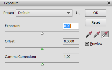 The Exposure slider adjusts the brightness of the image similar to the photographic exposure. The Offset slider moves the brightness values into a certain direction without taking shadow or highlight rescue measures. The Gamma Correction slider applies a brightness correction that is known from computer monitors and is similar to the middle slider of the Levels adjustment.