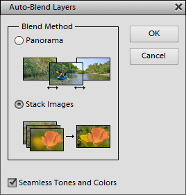 4. Select Stack Images from the Blend Method options. If desired, activate the check box for seamless tones and colors. Finally press OK.