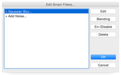 6a. In the Edit Smart Filter dialog select a filter in the list and click one of the buttons to either edit the filter settings or the filter blending, to enable or disable the filter or to delete it.