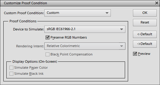 The Device to Simulate combo box has the current color profile selected, which is usually sRGB, by default. To view your image with another profile, select another item from this combo box. Best keep the Preserve RGB Numbers check box activated, unless you have some color management knowledge.