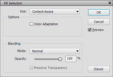The Sampling Options group lets you hide the sampling area, adjust its opacity, change its color and invert it. The Fill Settings group offers a Color Adaptation option for making the content-aware fill focus on adjusting colors. The Mode and Opacity controls blend the fill content with the underlying image. The Output To combo box defines if the filling will be added to the current layer, as a new layer or on a duplicated layer.