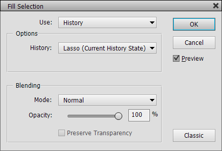 The History option lets you fill the selection or layer with an image from another history state. Please select the history state from the History combo box.