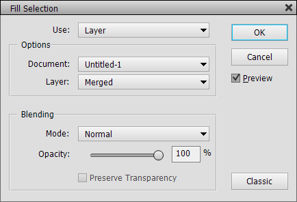 The Layer option fills the selection or layer with the contents of another pixel layer from the same or another document. Please select the document and the layer from the appropriate combo boxes.
