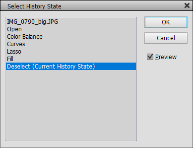 The History Brush lets you paint the image data of another history state at the current history state. At first you will see a Select History State dialog for choosing the history state that you want to paint with. If the Preview check box is active, the selected history state is automatically displayed. This way you can be sure to select the history state in case you are not sure of its name. After clicking OK the selected history state will be copied as a new layer, whose content can now be revealed by painting with the automatically activated brush tool. If you do not want to use the brush tool and reveal the whole history state, simple use the Ctrl + I key shortcut or select Filter > Adjustments > Invert.