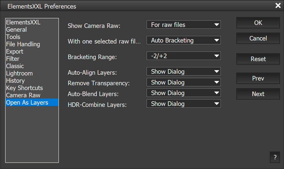 The With one selected raw file combo box defines what is done if only one file is selected on the Open As Layers dialog. The No Bracketing option simply opens only one file. The Auto Bracketing option shows the Camera Raw dialog only once and then automatically creates two additional exposure variations, whose exposure difference depends on the Bracketing Range combo box. The Manual Bracketing option displays the Camera Raw dialog three times: The first time with normal exposure, the second time with under exposure and the third time with overexposure. In each case you can manually adjust the Camera Raw settings. Please note that Manual Bracketing overrides the Never setting of the Show Camera Raw option.