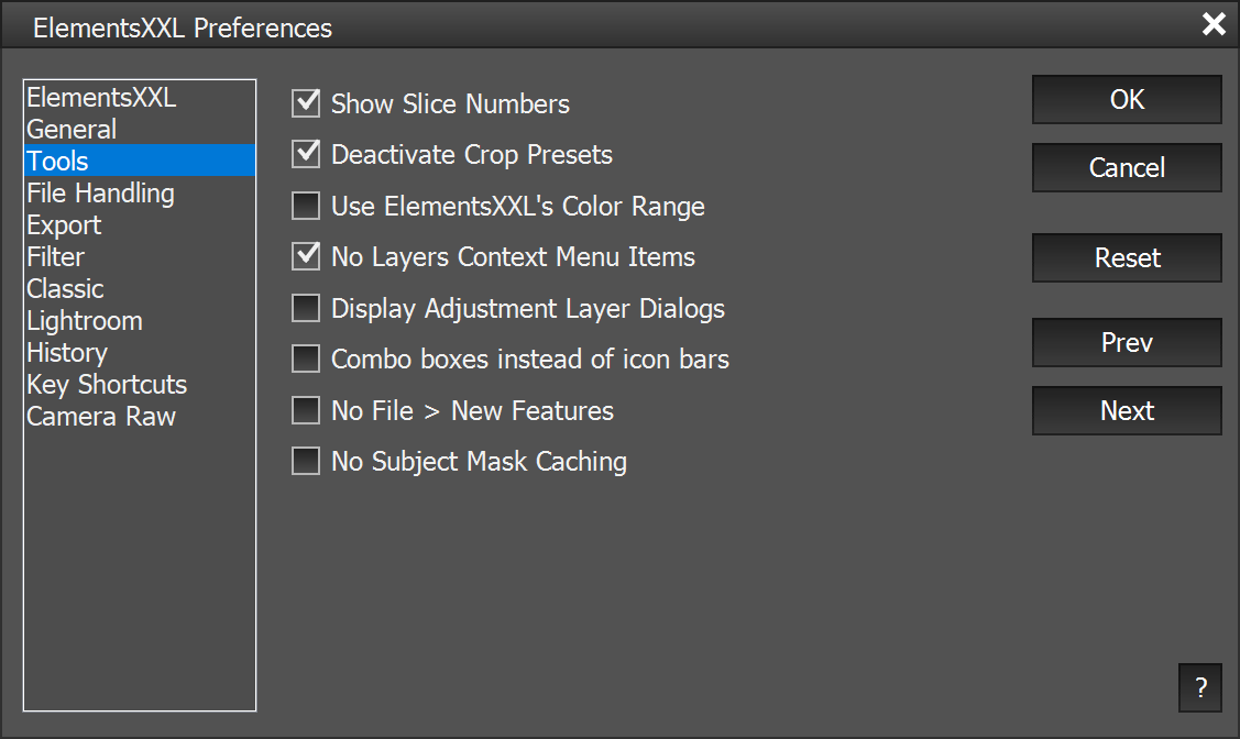 The Deactivate Crop Presets check box removes the presets combo box from the Tool Option bar of the crop tool in case it causes problems. The Use ElementsXXL's Color Range check box displays the Color Range dialog of ElementsXXL instead of the one of Photoshop Elements, which is a bit buggy.