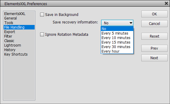 The Save recovery information combo box allows you to automatically save all open documents to a temporary folder in a certain time interval. When the documents are saved for recovery, you can see a small progress window in the top left corner of the Photoshop Elements main window. If you have a lot of documents or very big documents opened, the saving process can take some time and you have to wait. The recovery information is deleted if Photoshop Elements exits without crashing. If Photoshop Elements crashes and is run again, a message will ask you if you want to recover the documents that were lost during the crash.