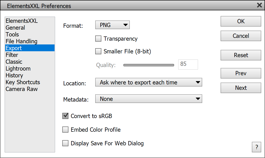If you click on this menu item on the Preferences sub menu, a dialog window is opened that lets you change the settings of Elements XXL. You can switch between different preferences groups by using the list on the right or by clicking the Prev and Next buttons. To set all options to the original default values click the Reset button. Press OK to apply the changes on this dialog or Cancel to discard them.