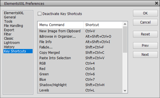 The Deactivate Key Shortcuts check box deactivates (and activates again) the key shortcuts of ElementsXXL. All available key shortcuts are shown in the list below.