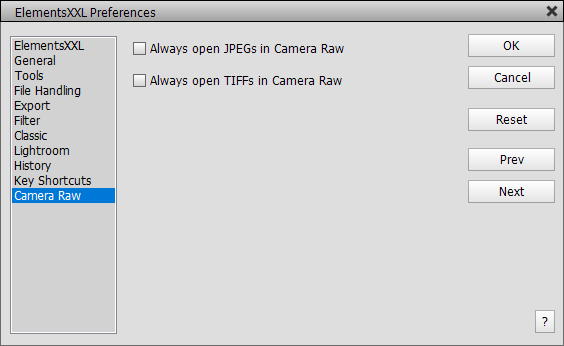 The Always open ... in Camera Raw check boxes let you always display JPEG or TIFF files in Camera Raw when opening them in Photoshop Elements.