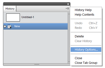 The menu of the History panel offers a "History Options" item, which displays the History page of the ElementsXXL Preferences dialog. These options can be used to change the behavior of the history panel. For more information see the section about Preferences > ElementsXXL.
