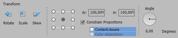 ElementsXXL also adds a Content-Aware check box to the tool options of the Transform tool, which can be invoked with the Ctrl + T key shortcut or various menu items on the Rotate, Transform and Resize sub menus of the Image menu. By activating the Color Adaptation check box the content-aware algorithm adjust colors in the process, so it basically uses a different content-aware algorithm.