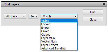 The Find Layers dialog lets you select layers in the Layers panel according to their name, kind, used style effect, blend mode or other attribute. The first combo box on the left lets you select the search type and the third combo box or text box lets you choose or enter a search item. The combo box in the middle defines if the search will look for layers that match (=) the search item or does not match it (!=).