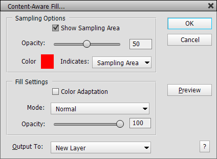 The Sampling Options group lets you hide the sampling area, adjust its opacity, change its color and invert it. The Fill Settings group offers a Color Adaptation option for making the content-aware fill focus on adjusting colors. The Mode and Opacity controls blend the fill content with the underlying image. The Output To combo box defines if the filling will be added to the current layer, as a new layer or on a duplicated layer.