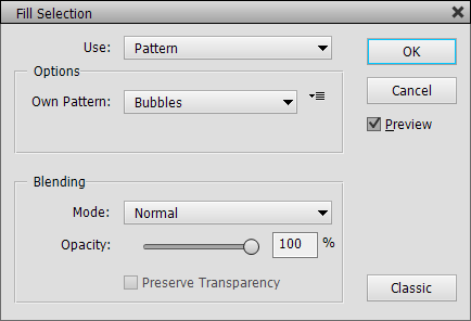 The Blending controls allow blending the fill result with a certain blend mode and opacity values. This additionally lets you adjust or weaken the effect. When activated, the Preserve Transparency check makes sure that transparent areas are not filled with content and made opaque.