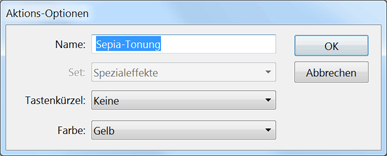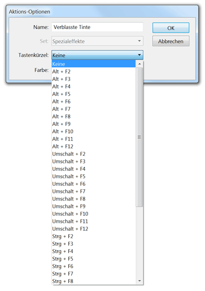 Sie können ein Tastenkürzel für eine Aktion auf dem Dialog "Neue Aktion" festlegen, wenn Sie eine neue Aktion erstellen. Ein ähnlicher Dialog erscheint, wenn Sie rechts neben einem Aktionsnamen in der Aktionenliste doppelt klicken oder wenn sie den Bedienfeldmenüpunkt "Aktions-Optionen" wählen.